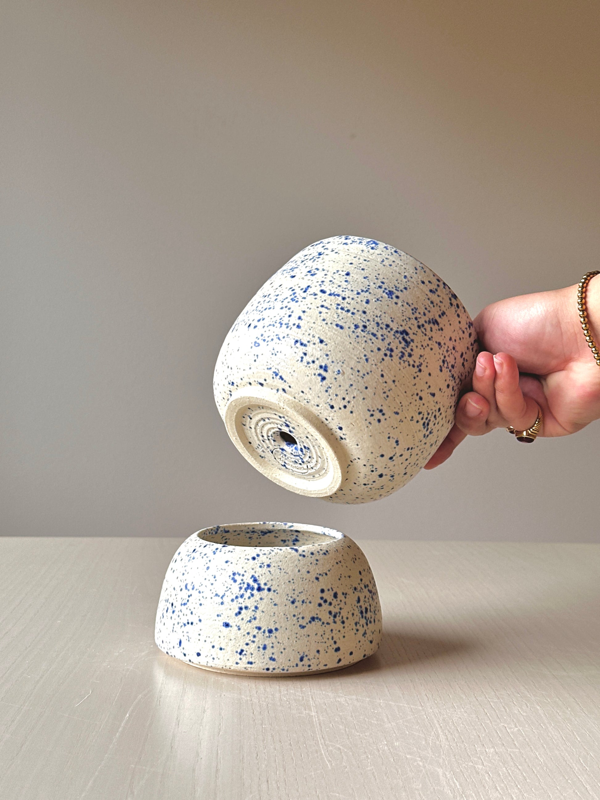 tiered plant pot, top has drainage hole and cache tray is at the bottom. finished in a speckled blue and white glaze