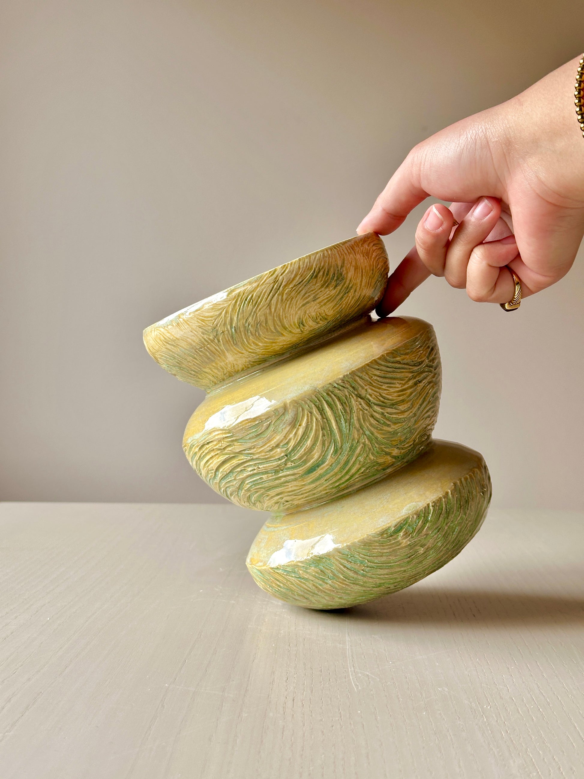 vase with carved lime green wave-like detailing, perfect for a bouquet or as a sculptural vessel in your home.
